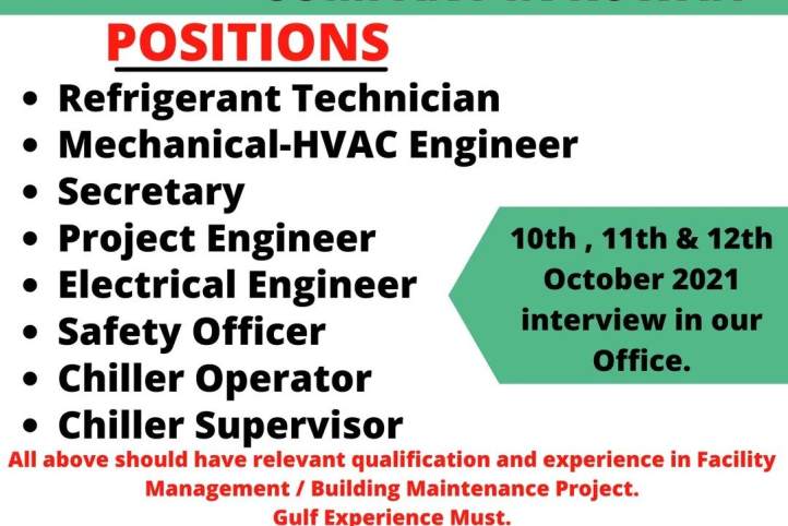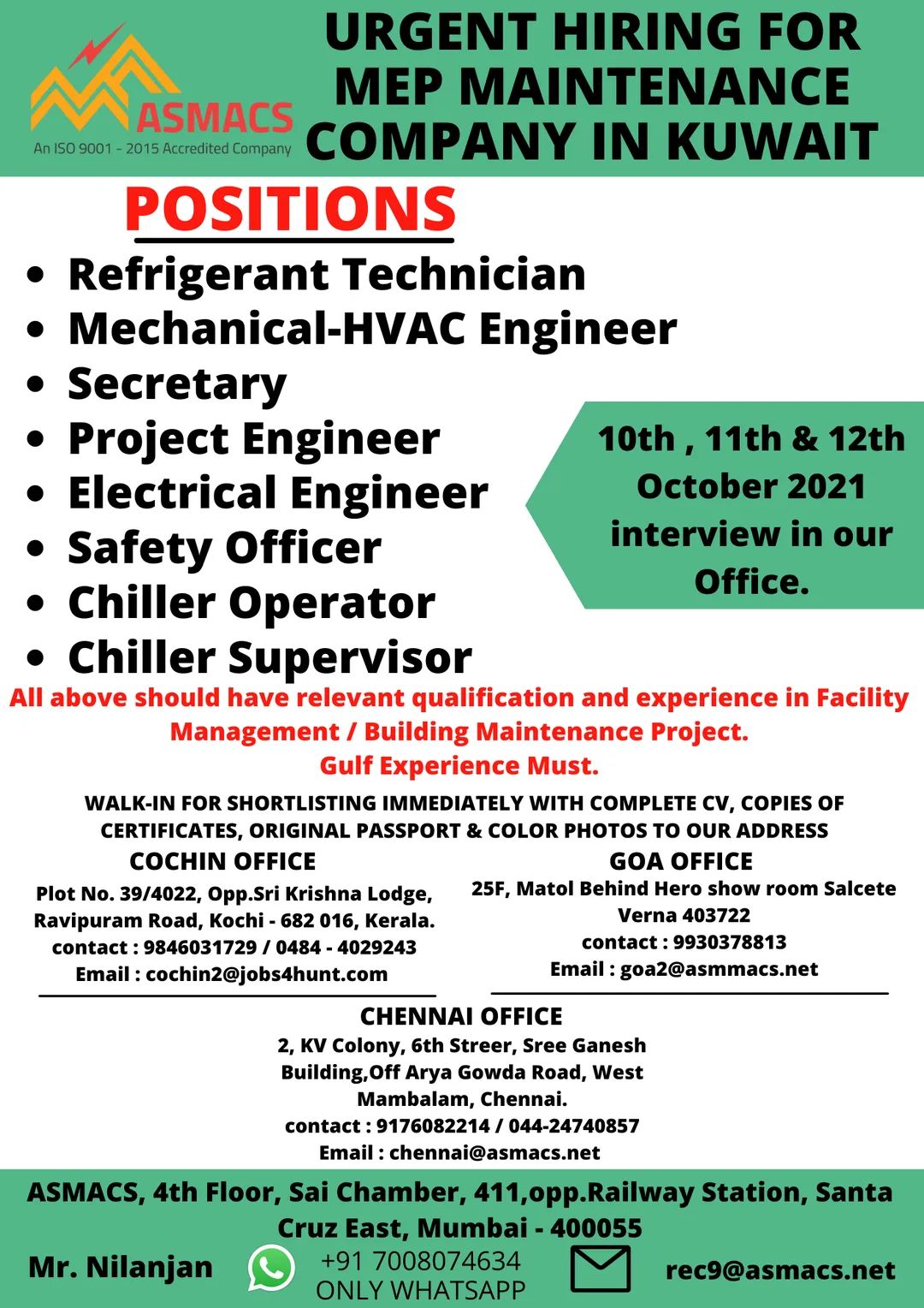 HomeKuwait JobsJobs in KuwaitKuwait JobsJobs in KuwaitBy Gulf JobOctober 7, 20210ShareFacebookWhatsApp WhatsApp Group Join WhatsApp Jobs in KuwaitRefrigerant TechnicianMechanical-HVAC EngineerSecretaryProject EngineerElectrical EngineerSafety OfficerChiller OperatorChiller SupervisorContact Details:Email: rec5@asmacs.netPhone: +91 9930033047Office Name:Asmacs WhatsApp Group Join WhatsApp Previous articleQatar Classified Jobs~7 OctoberNext articleHiring for KuwaitGulf Job