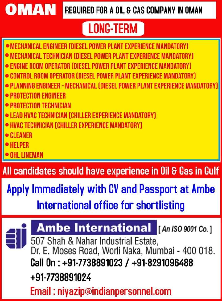 Technician (Diesel Power Plant Experience Mandatory) - Engine Room