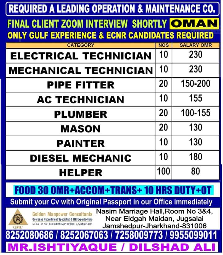 HomeOman JobsJobs in OmanOman JobsJobs in OmanBy Gulf JobFebruary 15, 20211ShareFacebookWhatsApp WhatsApp Group Join WhatsApp Jobs in OmanElectrical TechnicianMechanical TechnicianPipe FitterAC TechnicianPlumberMasonPainterDiesel MechanicHelperContact Details:Phone: 8252080686 / 8252067063 / 7258009773 / 9955099011Office Name:GMC Jamshedpur WhatsApp Group Join WhatsApp Previous article13 February ~ Abroad JobsNext articleJobs in Abu DhabiGulf Job 1 COMMENTComments are closed.
