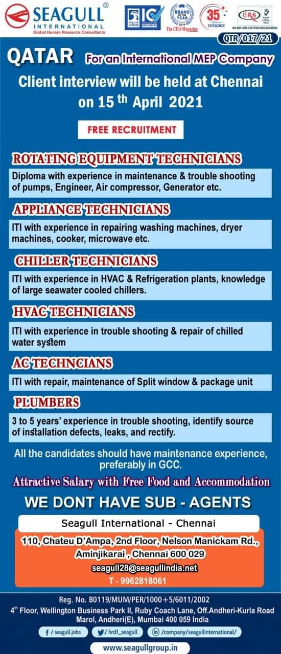 HomeQatar JobsJobs in QatarQatar JobsJobs in QatarBy Gulf JobApril 11, 20210ShareFacebookWhatsApp WhatsApp Group Join WhatsApp Jobs in QatarRotating Equipment TechniciansApplication TechniciansChiller TechniciansHVAC TechniciansAC TechniciansPlumbersContact Details:Email: seagull28@seagullindia.netPhone: 9962818061Office Name:Seagull International WhatsApp Group Join WhatsApp Previous articleJobs in OmanNext articleJobs in QatarGulf Job
