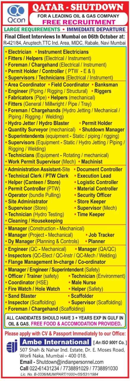 - Supervisors (Equipment – Static / Hydro Jetting / Piping /