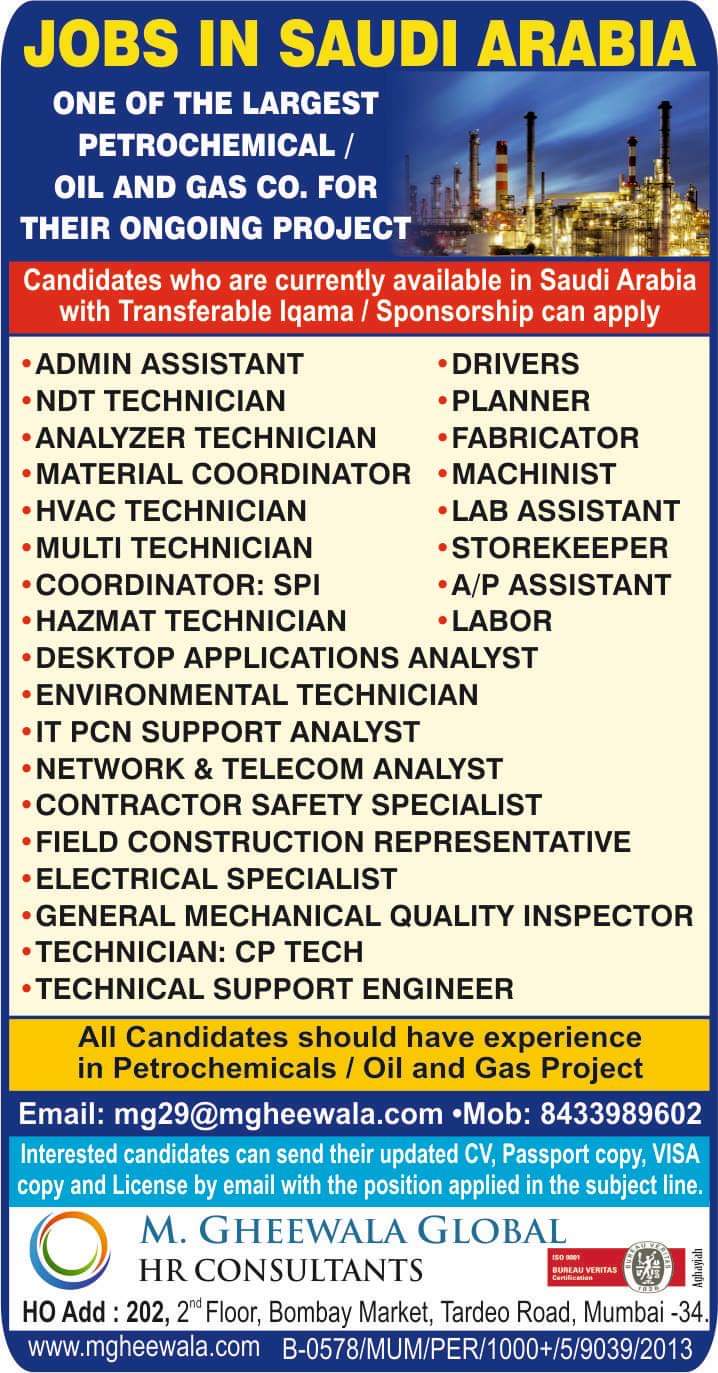 There are many vacancy in Saudi Arabia for one of the largest petrochemical / white and gas company for their upcoming project, vacancies position are listed below.