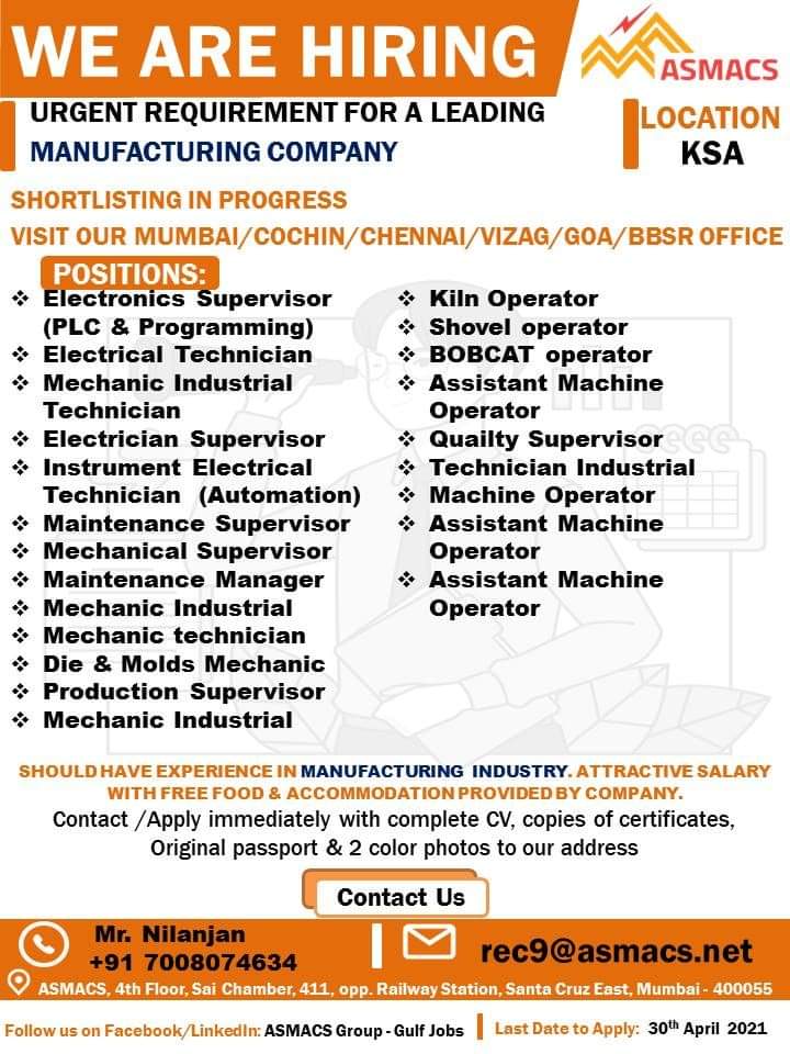 - Electrical Supervisor (PLC & Programming)