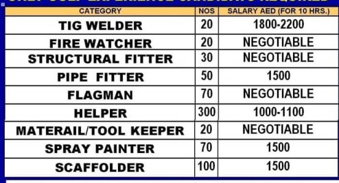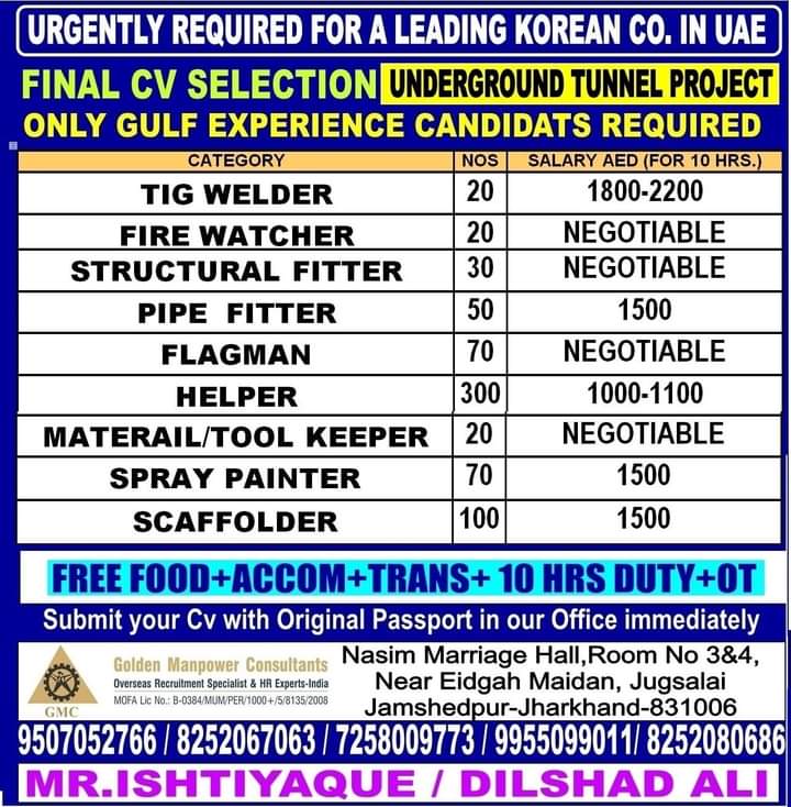 HomeUAE JobsJobs in UAEUAE JobsJobs in UAEBy Gulf JobDecember 25, 20200ShareFacebookWhatsApp WhatsApp Group Join WhatsApp Jobs in UAETig WelderFire WatcherStructural FitterPipe FitterFlagmanHelperMaterial / Tool KeeperSpray PainterScaffolderContact Details:Phone: 9507052766 / 8152067063 / 7258009773 / 9955099011 / 8252080686Office Name:GMC Jamshedpur WhatsApp Group Join WhatsApp Previous articleJobs in Saudi ArabiaNext articleJobs in QatarGulf Job