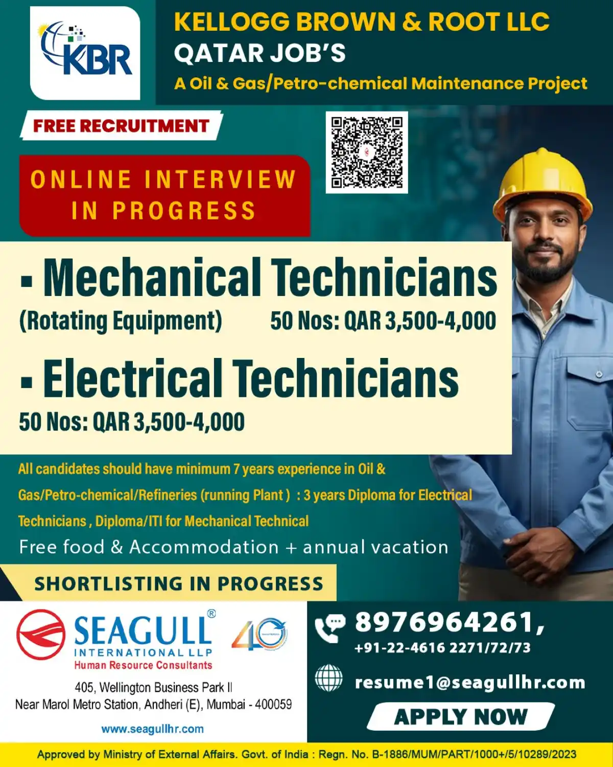 KBR Qatar announces urgent hiring for 100+ Mechanical & Electrical Technicians for Oil & Gas project. Salary QAR 3,500-4,000 + Free Accommodation & Food. Online interviews in progress.