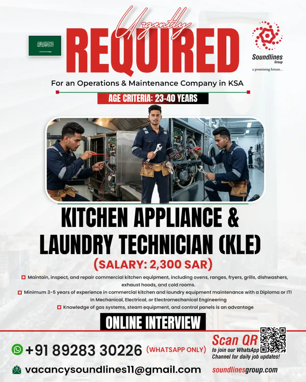 Soundlines Group seeks a Kitchen Appliance & Laundry Technician (KLE) for operations in KSA. Salary 2,300 SAR. 3-5 years experience, Diploma/ITI. Online interview. Apply now!