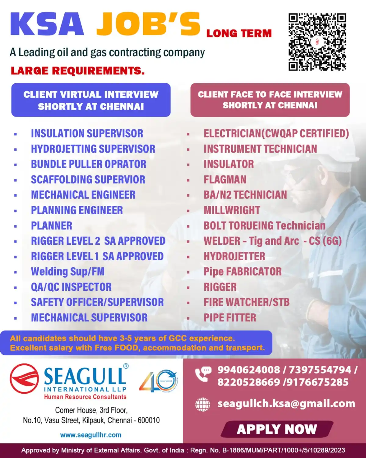 Apply now for various oil and gas jobs in KSA. Virtual and face-to-face interviews in Chennai. Free food, accommodation, and transport. GCC experience required. Contact Seagull International LLP.