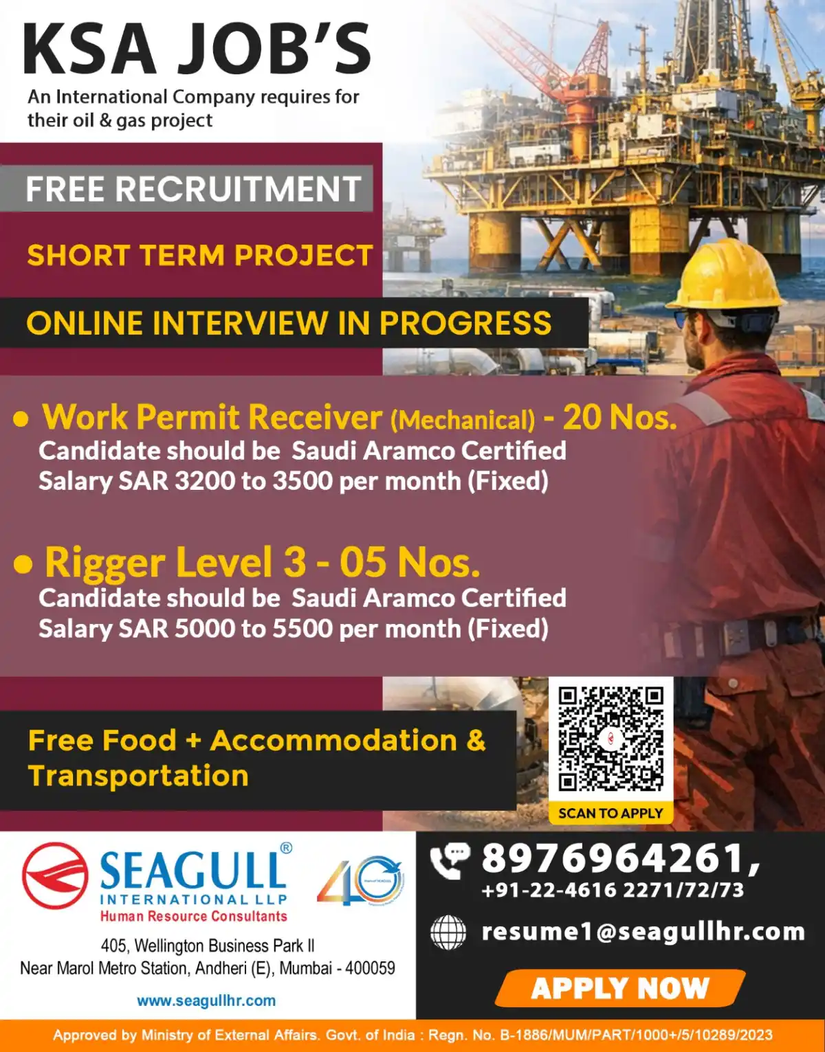 Interested candidates can apply by sending their resume to resume1@seagullhr.com or contacting the recruitment office at the numbers provided.