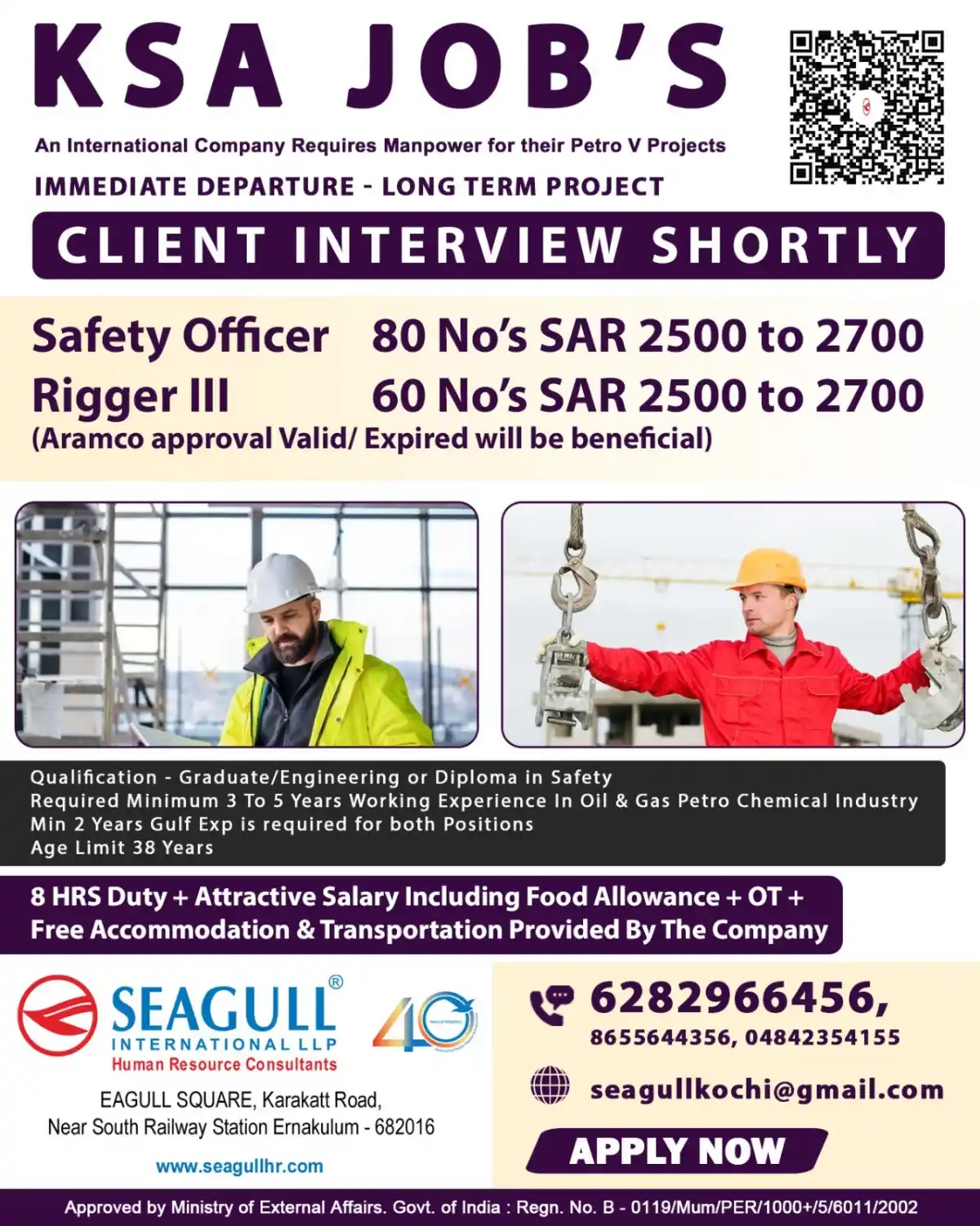 Apply now for Safety Officer and Rigger III positions in KSA Petro V Projects. Immediate departure, long-term contract, attractive salary with free accommodation and transportation. Client interview shortly.