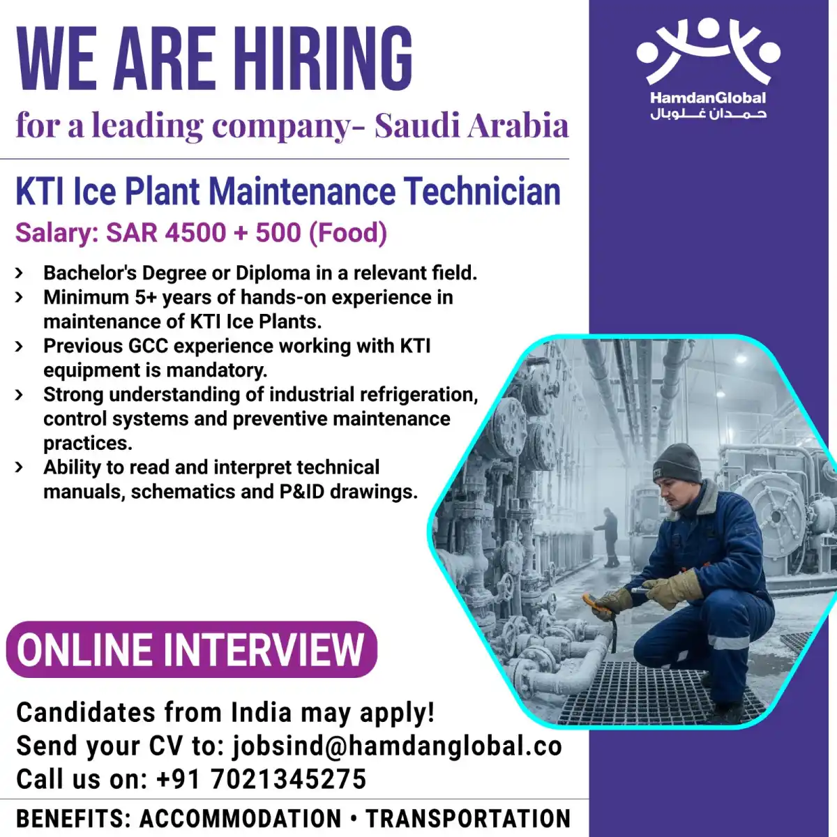 Apply for KTI Ice Plant Maintenance Technician position in Saudi Arabia. Salary SAR 4500 + SAR 500 food allowance. Minimum 5 years experience with KTI equipment required. Online interview for Indian candidates. Benefits include accommodation and transportation.