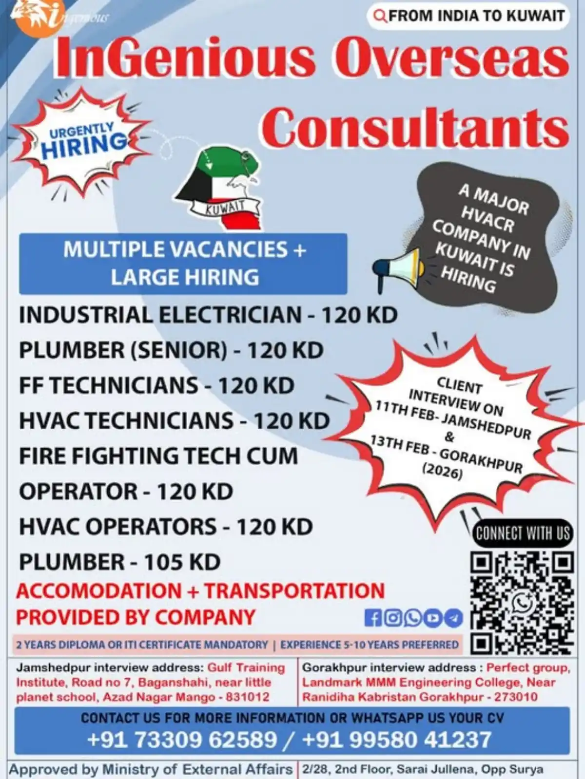 Major HVACR company in Kuwait hiring Industrial Electricians, Plumbers, HVAC & Fire Fighting Technicians. Client interviews on 11th Feb in Jamshedpur & 13th Feb in Gorakhpur 2026. Salary up to 120 KD with accommodation & transportation.