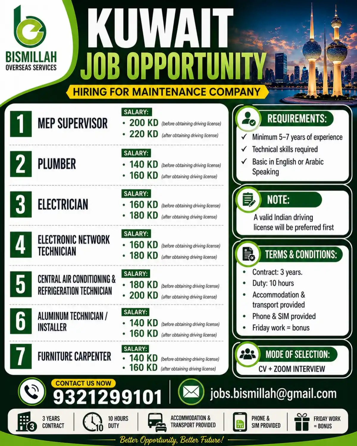 Bismillah Overseas Services is hiring for a maintenance company in Kuwait. Openings: MEP Supervisor, Plumber, Electrician, Network Technician, AC Technician, Aluminum Technician, Furniture Carpenter. Salaries up to 220 KD. Apply with CV & Zoom interview.