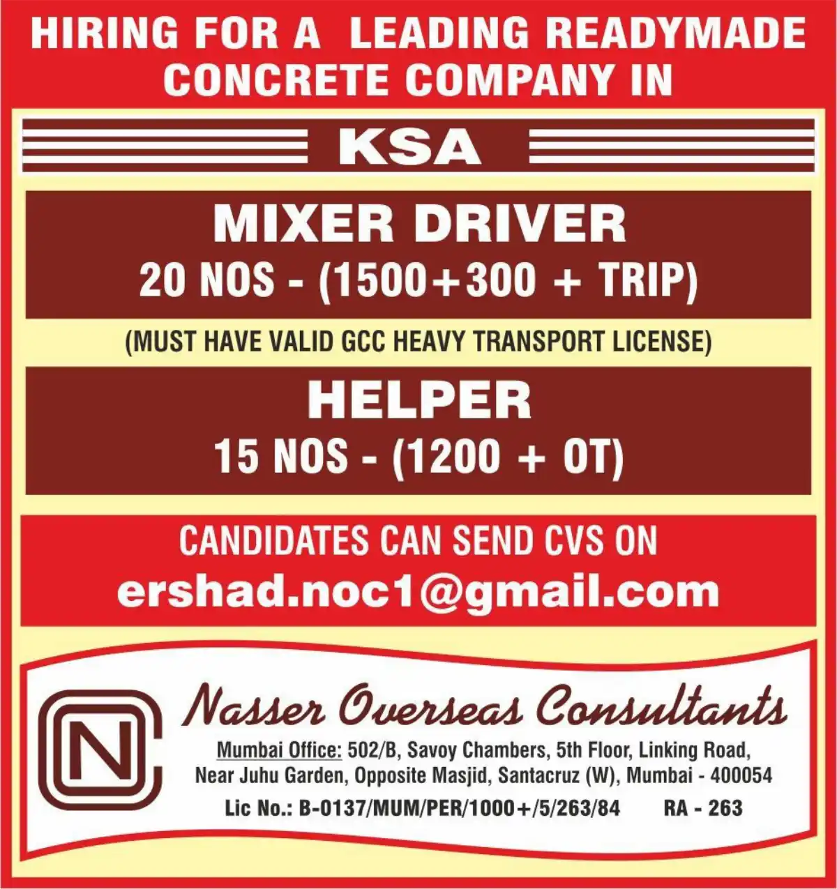 Apply for Mixer Driver (20 positions) & Helper (15 positions) jobs in KSA. GCC Heavy Transport license required for drivers. Competitive salary with benefits. Send CV to ershad.noc1@gmail.com