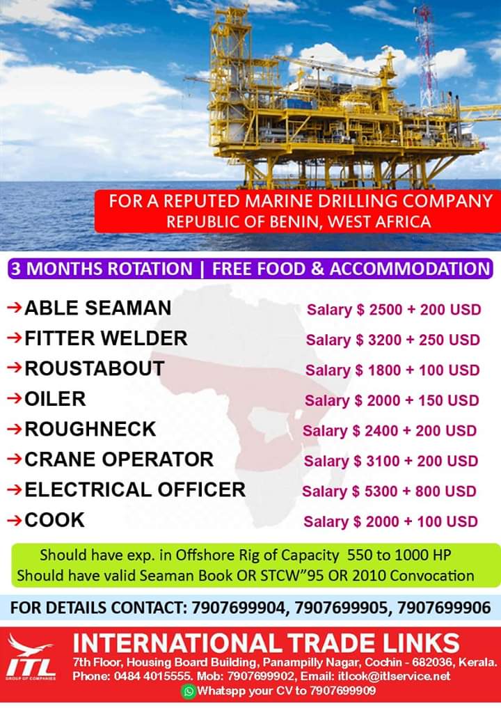 HomeUncategorizedMarine jobsUncategorizedMarine jobsBy Gulf JobJune 2, 20200ShareFacebookWhatsApp WhatsApp Group Join WhatsApp Required for reputed Marine drilling company in West Africa.Able SeamanFitter welderRoustaboutOilerRoughneckCrane operatorElectrical officerCook Phone are mentioned below in image, missing candidate main contractor given phone number. WhatsApp Group Join WhatsApp Previous articleOpening for Saudi ArabiaNext articleNursing jobs in IrelandGulf Job