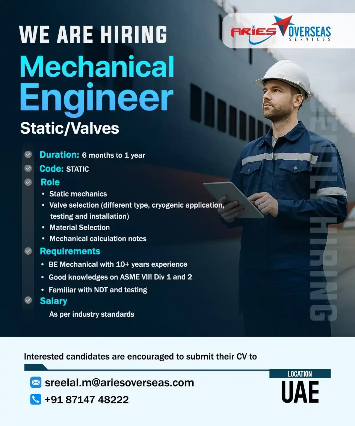 ARIES OVERSEAS is hiring a Mechanical Engineer II for Static/Valves role in UAE. Requires 10+ years experience in mechanical engineering with ASME standards. Contract duration 6 months to 1 year. Apply now!