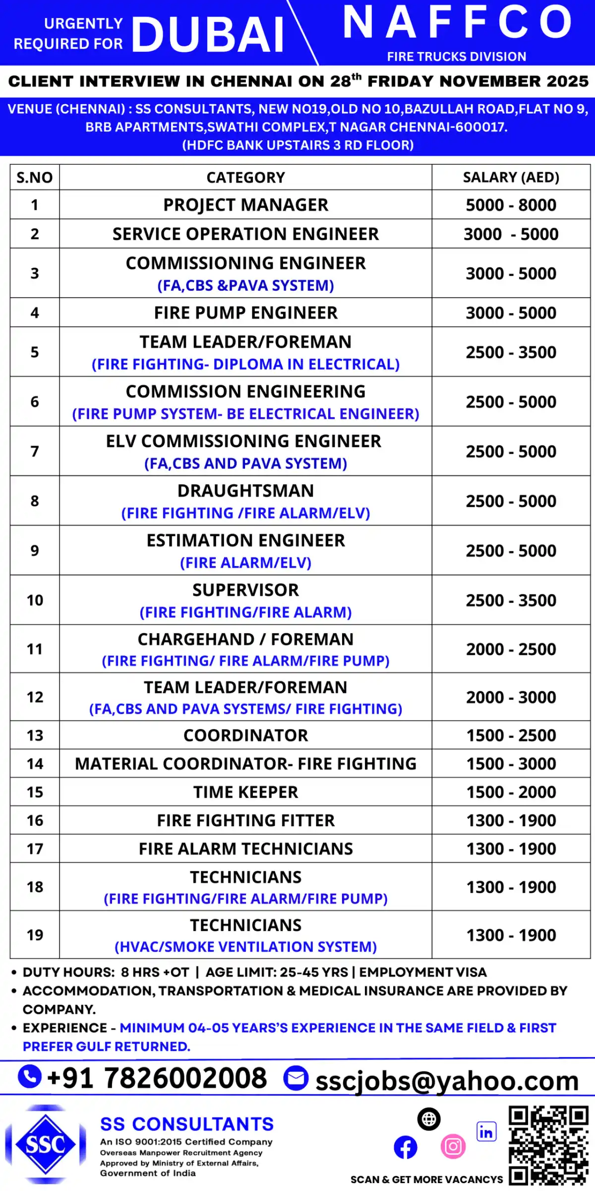 Apply now for various positions in NAFFCO Fire Trucks Division in Dubai. Client interview in Chennai on 28th November 2025. Accommodation, transport, and medical insurance provided. Minimum 4-5 years experience required.