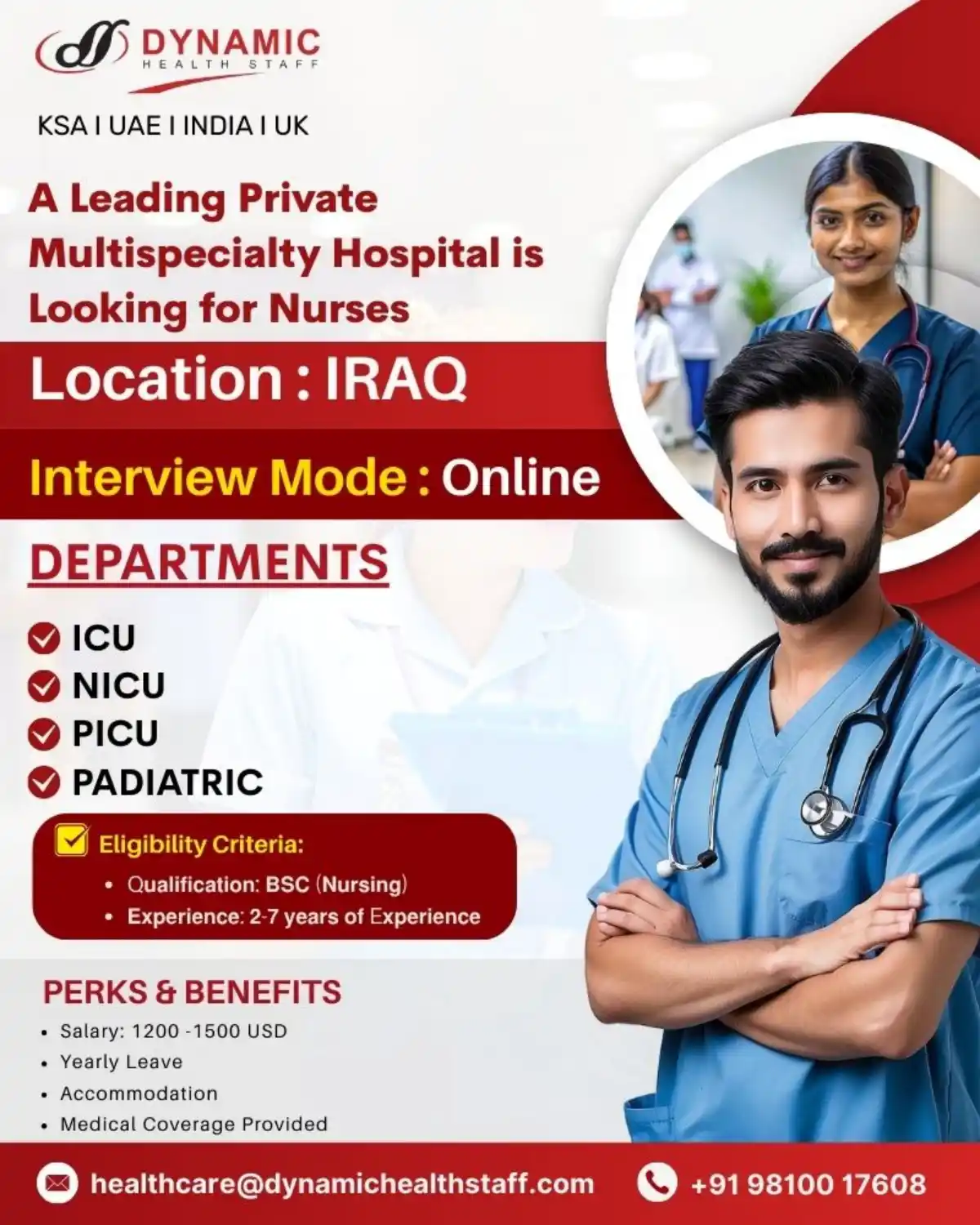 Apply for nursing positions in Iraq with Dynamic Health Staff. Roles available in ICU, NICU, PICU, and Pediatric departments. BSC Nursing and 2-7 years experience required. Competitive salary of 1200-1500 USD with benefits.