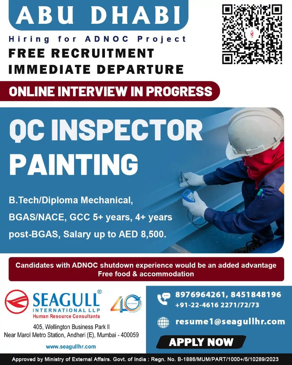 SEAGULL 46 INTERNATIONAL LLP is conducting free recruitment for the position of OC Inspector (Painting) for the ADNOC Project in Abu Dhabi. We are offering immediate departure with online interviews currently in progress. This is an excellent opportunity for qualified candidates to join a prestigious project.