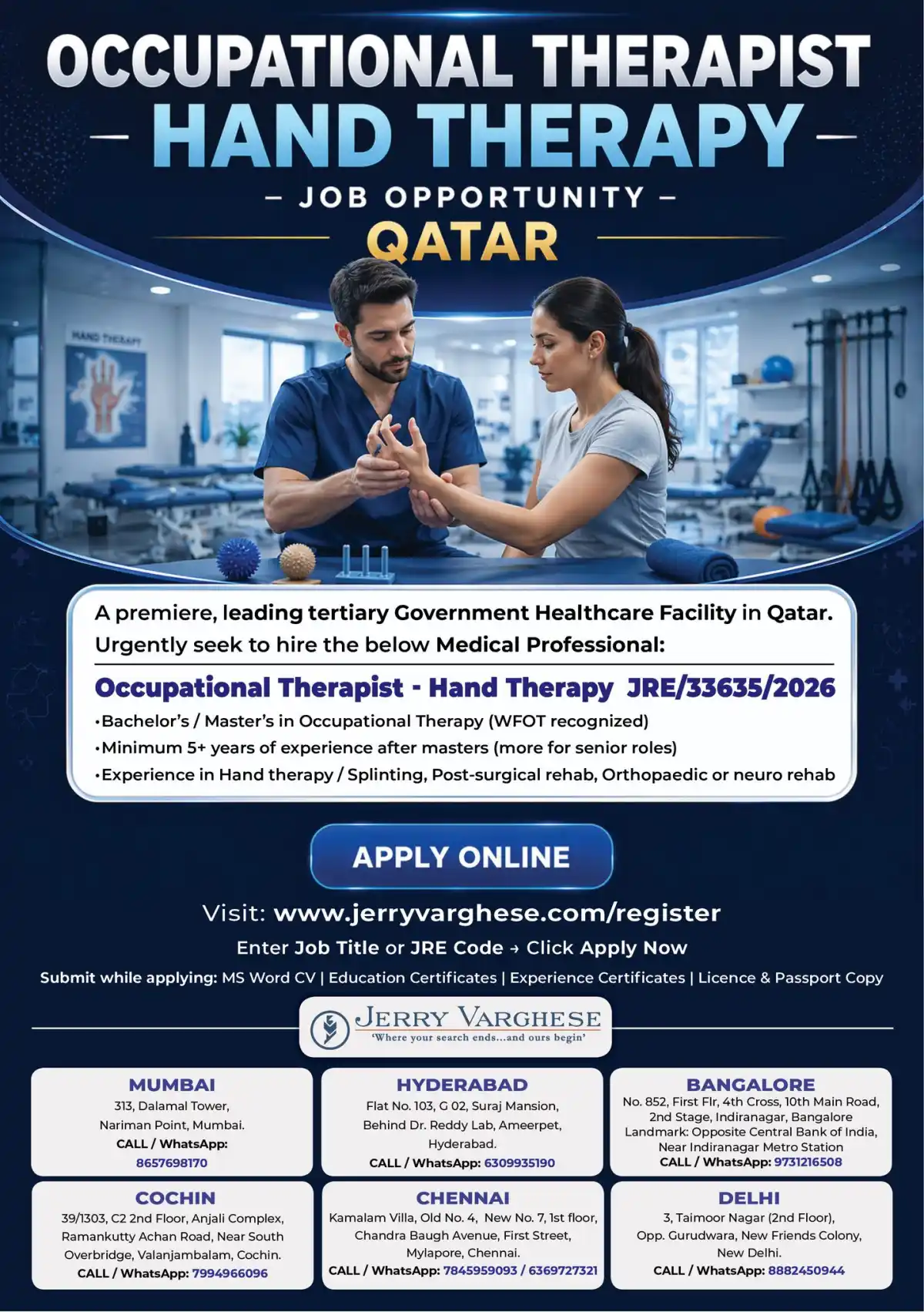 Exciting OT hand therapy job in Qatar at a leading government hospital. Requires Bachelor’s/Master’s in Occupational Therapy and 5+ years experience. Apply via Jerry Varghese.