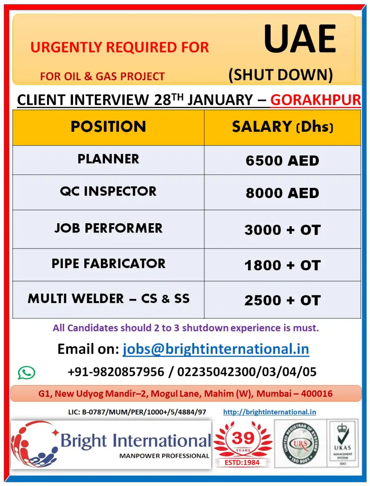 Bright International is urgently hiring for Oil & Gas shutdown project in UAE. Multiple positions available: Planner, QC Inspector, Job Performer, Pipe Fabricator, Multi Welder. Client interview in Gorakhpur on 28th January 2024. Apply now!