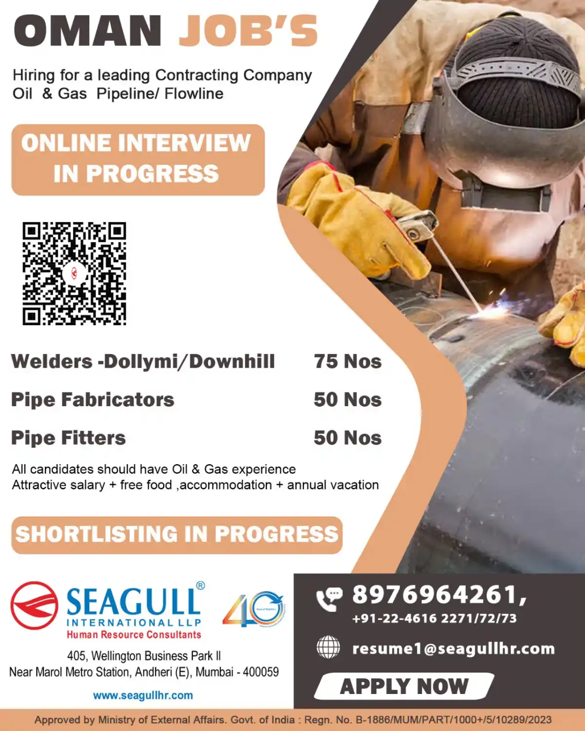 Leading contracting company hiring 175+ skilled professionals for Oil & Gas pipeline projects in Oman. Positions: 75 Welders (Dollymi/Downhill), 50 Pipe Fabricators, 50 Pipe Fitters. Attractive salary + free accommodation & food. Online interviews in progress.