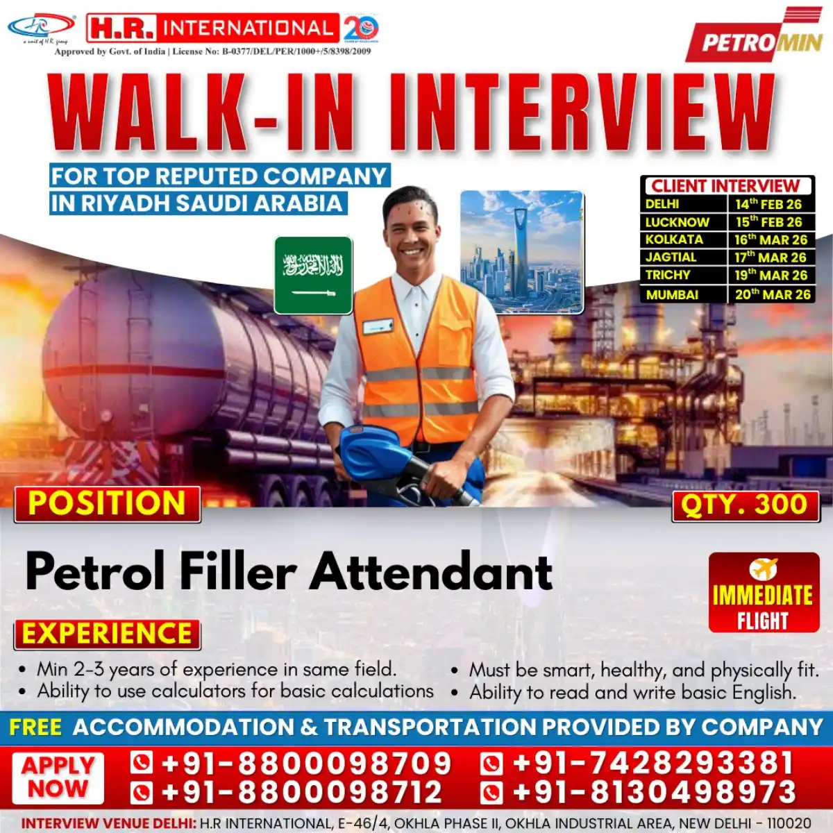 H.R. International, a Government of India approved recruitment agency (License No: B-0377/DEL/PER/1000+/5/8398/2009), is conducting walk-in interviews for 300 Petrol Filler Attendant positions with a top reputed company in Riyadh, Saudi Arabia. This is an excellent opportunity for experienced candidates seeking immediate employment with comprehensive benefits.