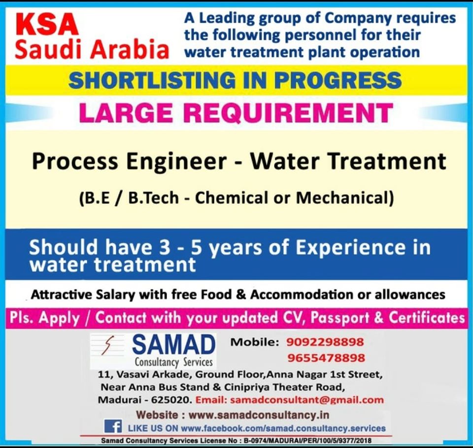 Process engineer required in a leading Group of company in Saudi Arabia. Candidate must have BE/ B.tech in chemical or mechanical. Candidates should have 3 to 5 year experience in water treatment plant. All the other details are mentioned in below image.