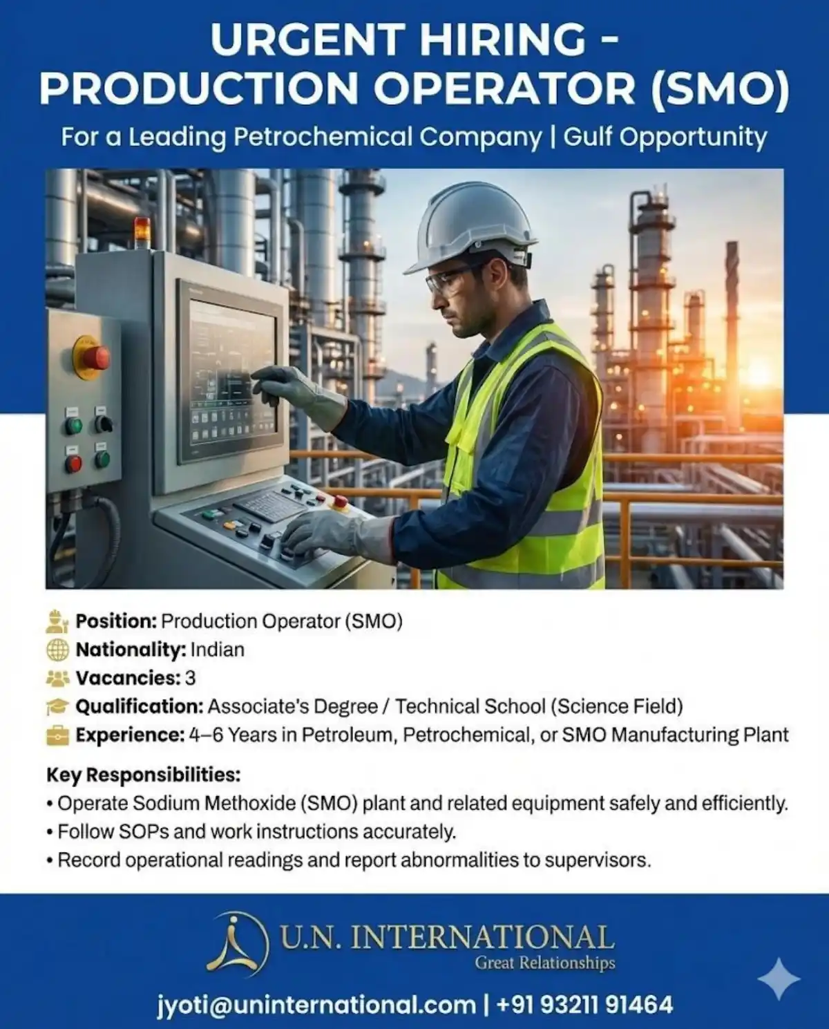 Urgent opening for Production Operator (SMO) in Gulf petrochemical plant. Required: 4-6 years experience in SMO manufacturing. Indian nationality. Apply now with U.N. International.