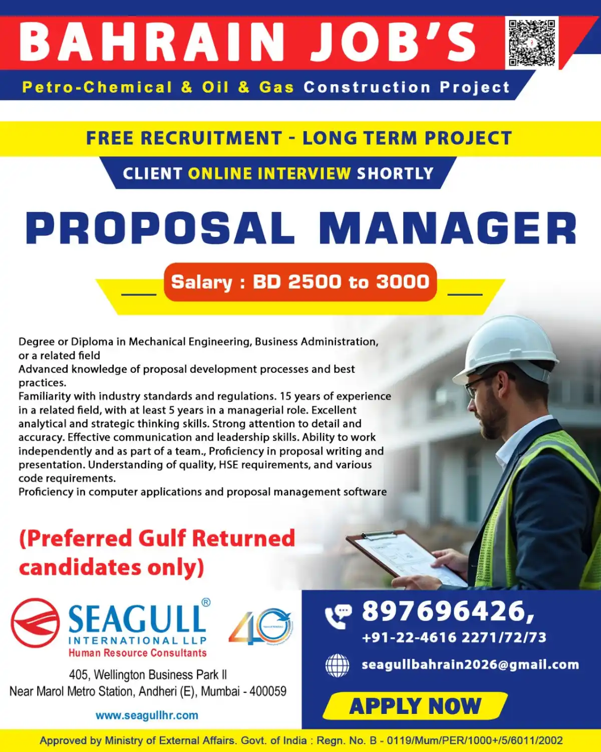 Seagull International LLP is currently recruiting for the position of Proposal Manager for a prestigious long-term Petro-Chemical & Oil & Gas Construction Project in Bahrain. This is a FREE RECRUITMENT opportunity with excellent career prospects.