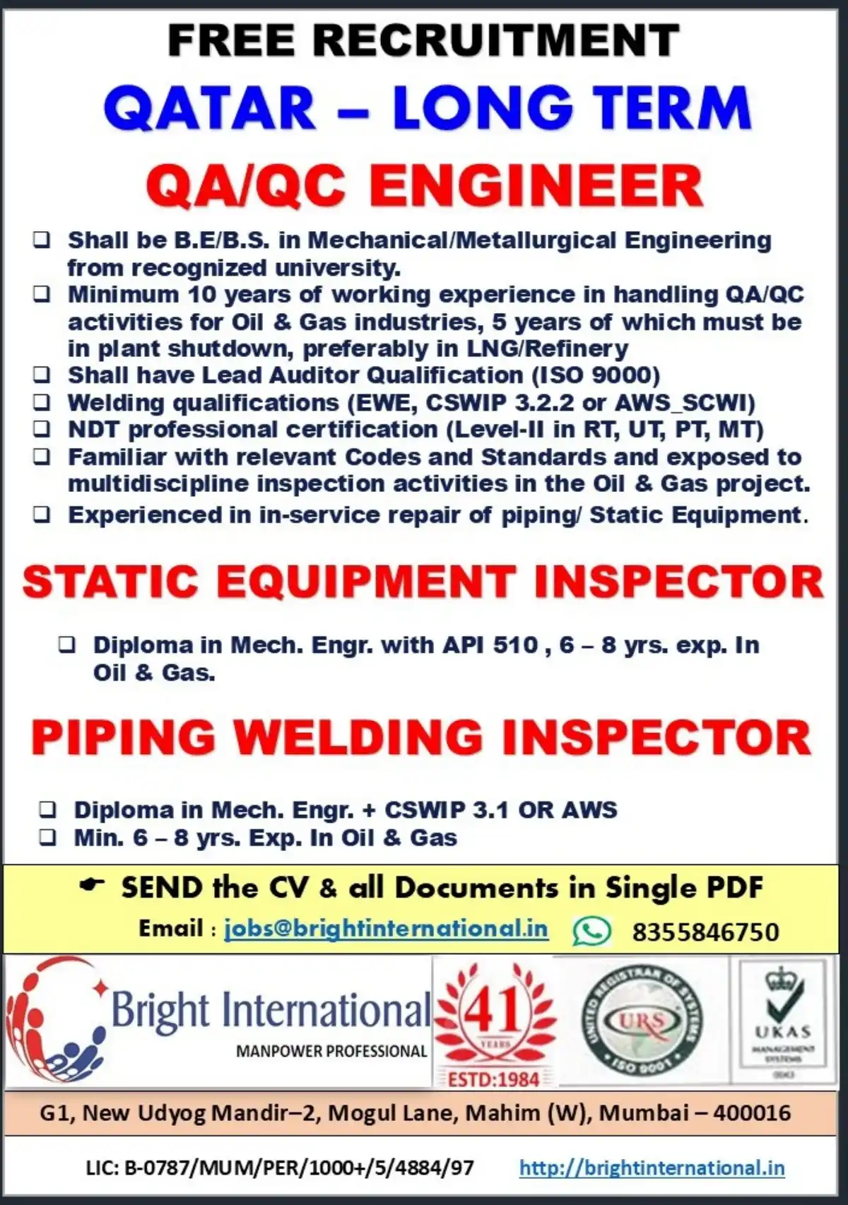 Apply for QA/QC Engineer position in Qatar with Bright International. Requires 10+ years in Oil & Gas, Lead Auditor certification, and experience in plant shutdown. Long-term opportunity.Bright International is recruiting for long-term positions in Qatar, including QA/QC Engineer, Static Equipment Inspector, and Piping Welding Inspector. These roles are critical for Oil & Gas projects, with a focus on quality assurance and control.