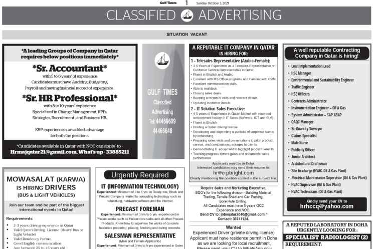 HomeQatar JobsQatar Classified Jobs~3 OctoberQatar JobsQatar Classified Jobs~3 OctoberBy Gulf JobOctober 3, 20211ShareFacebookWhatsApp WhatsApp Group Join WhatsApp Table of contents [hide]Classified JobsClassified JobsOnly for those candidates who are currently available in Qatar can ApplyClick Here To Download File Size: 1 MB Click Here To View WhatsApp Group Join WhatsApp Previous articleAbroad Jobs~2 OctoberNext articleJobs in QatarGulf Job 1 COMMENTComments are closed.