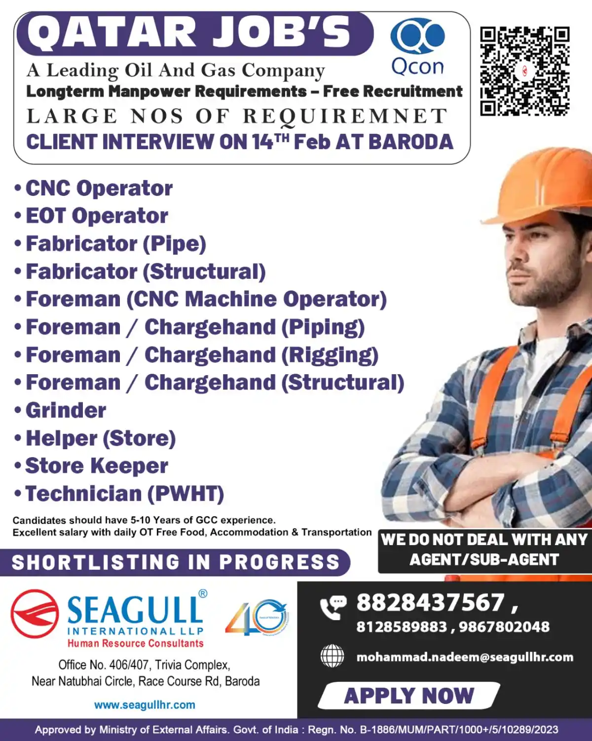 Apply for multiple job positions at Qcon in Qatar. Client interview on 14th February in Baroda. 5-10 years GCC experience required. Excellent salary with daily OT, free food, accommodation, and transportation.