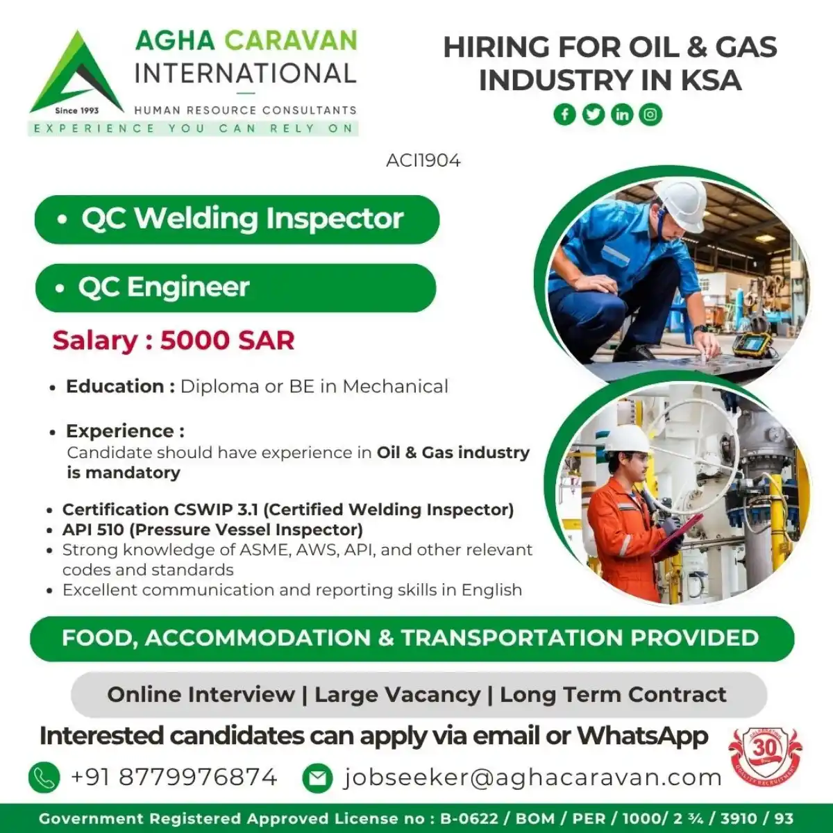 AGHA CARAVAN INTERNATIONAL, a trusted human resource consultant with over 30 years of experience since 1993, is recruiting for the Oil & Gas industry in Saudi Arabia (KSA). We are seeking qualified QC Welding Inspectors and QC Engineers for long-term contracts with attractive benefits.