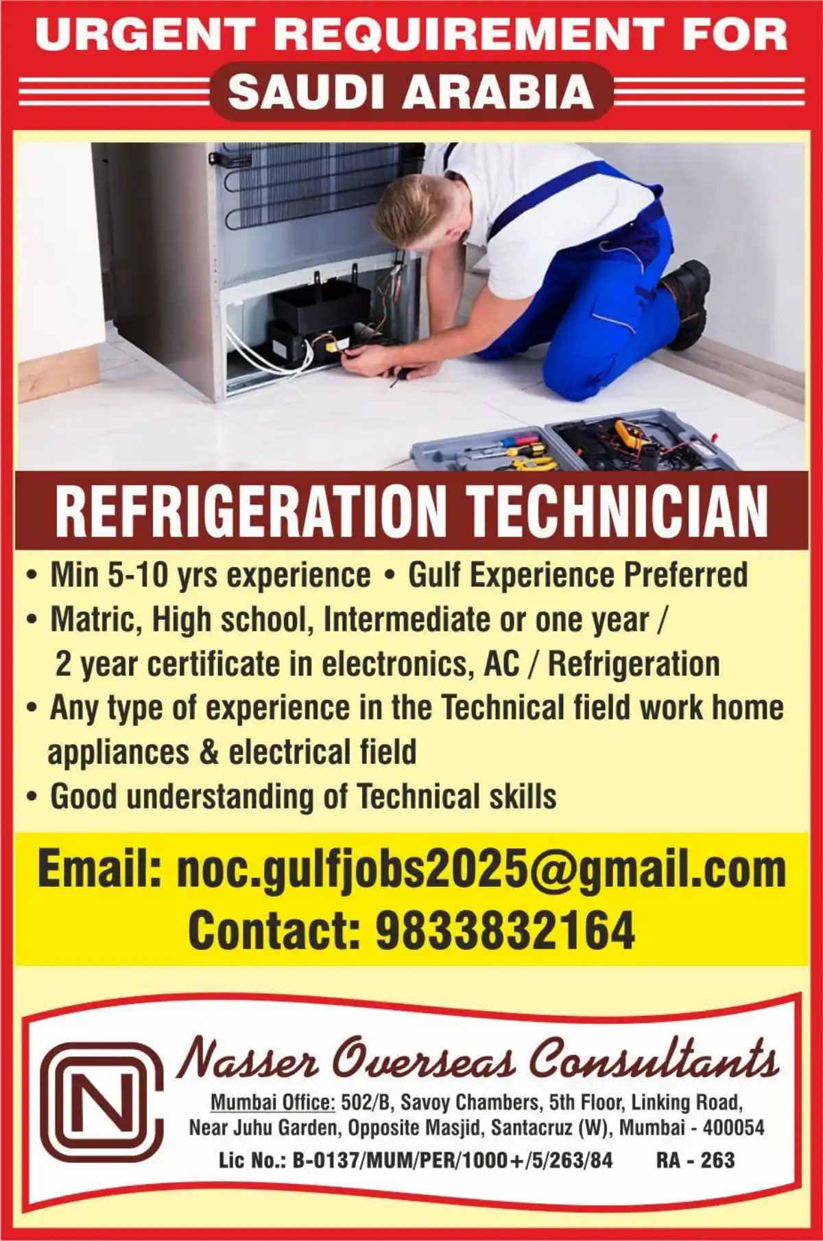 Apply for Refrigeration Technician jobs in Saudi Arabia with Nasser Overseas Consultants. 5-10 years experience required. Gulf experience preferred. Email: noc.gulfjobs2025@gmail.com