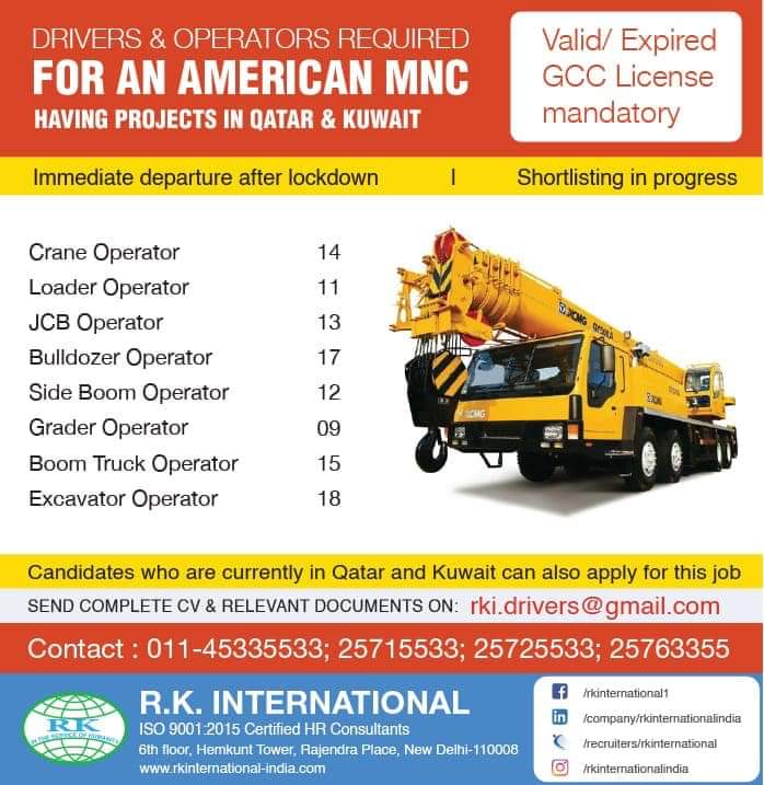 There is vacancy for drivers and operators in Qatar and Kuwait. GCC licence is mandatory to apply this post as mentioned below.