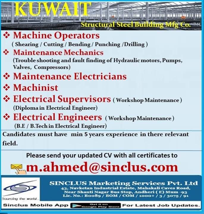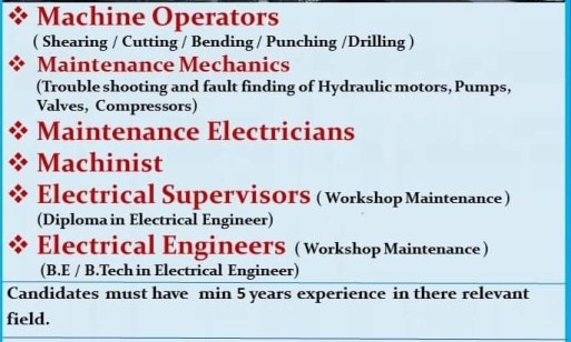 - Machine Operators (Shearing / Cutting / Bending / Punching /Drilling)