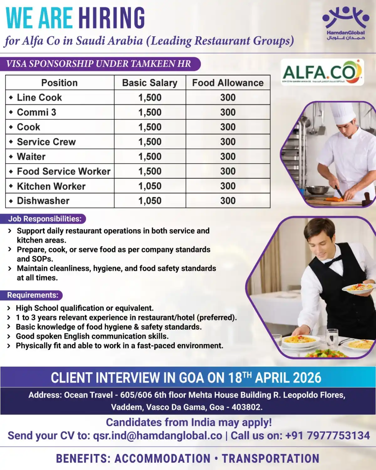 Apply for restaurant jobs in Saudi Arabia with visa sponsorship. Multiple positions available: Line Cook, Waiter, Service Crew, Kitchen Worker, Dishwasher & more. Basic salary 1,500 SAR + 300 SAR food allowance. Interview in Goa on 18th April 2026.