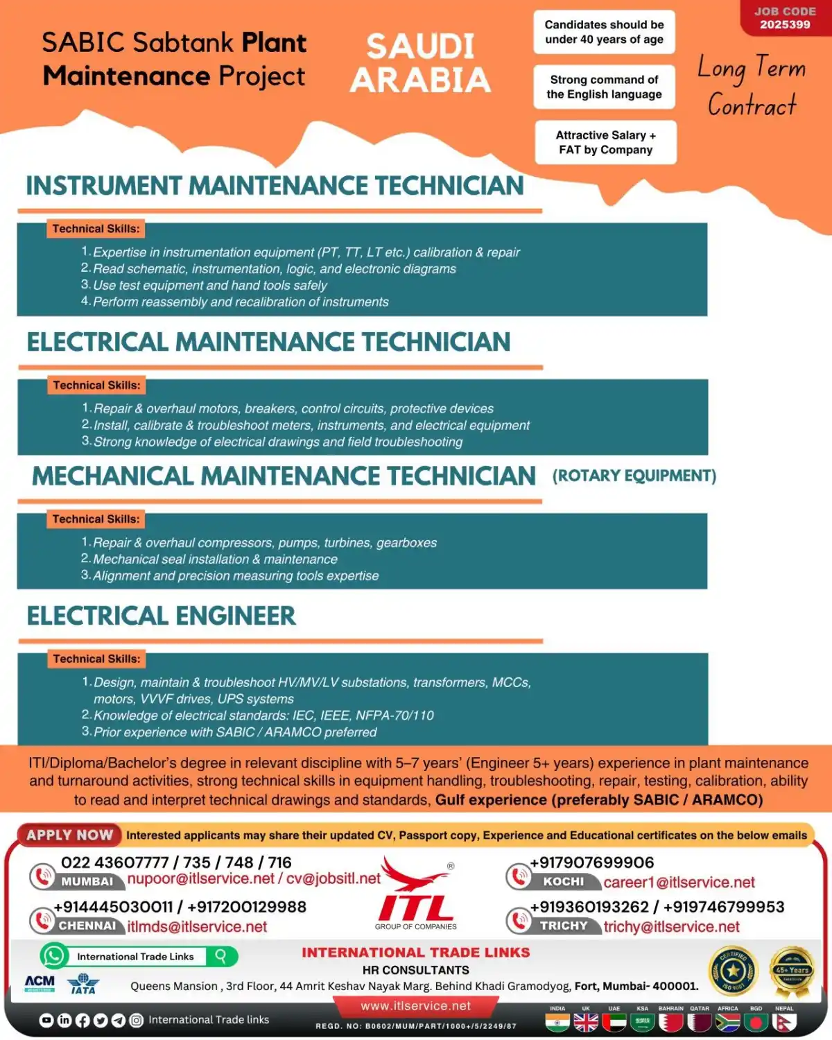 International Trade Links is recruiting skilled professionals for maintenance positions at SABIC Sabtank Plant in Saudi Arabia. This long-term contract offers an attractive salary and benefits, including FAT provided by the company.