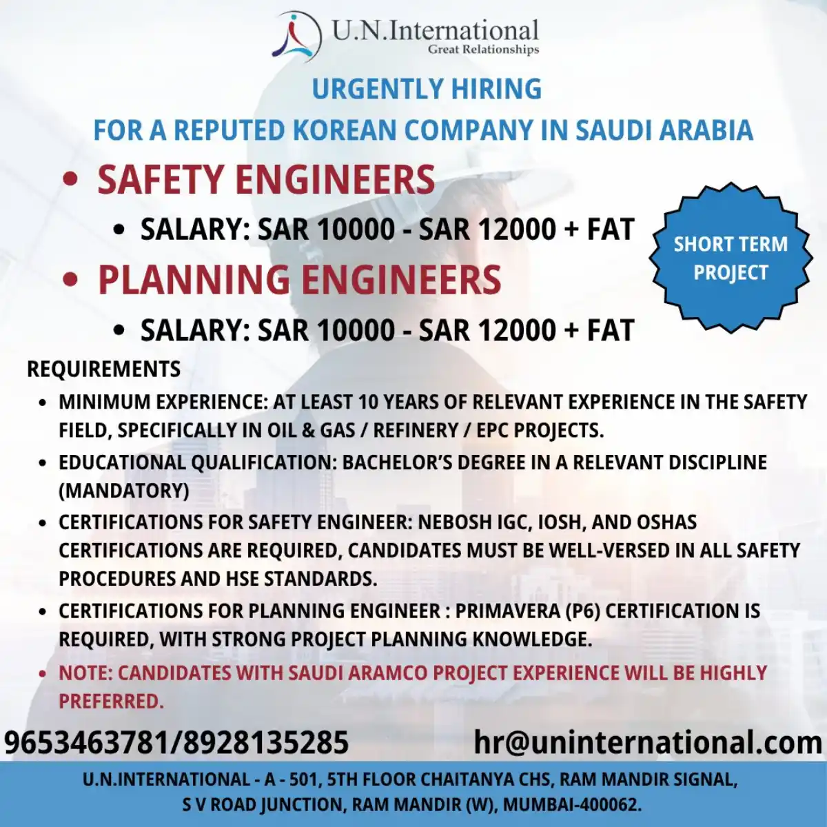 U.N. International is urgently seeking experienced Safety Engineers and Planning Engineers for a short-term project with a reputed Korean company in Saudi Arabia. This is a fantastic opportunity for professionals with extensive experience in the oil & gas, refinery, or EPC sectors to join a dynamic team.