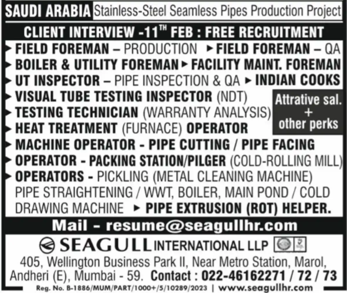 Seagull International LLP is recruiting for various positions for a prestigious Stainless Steel Seamless Pipes Production Project in Saudi Arabia. We are looking for skilled professionals to join our team and contribute to this large-scale manufacturing initiative.