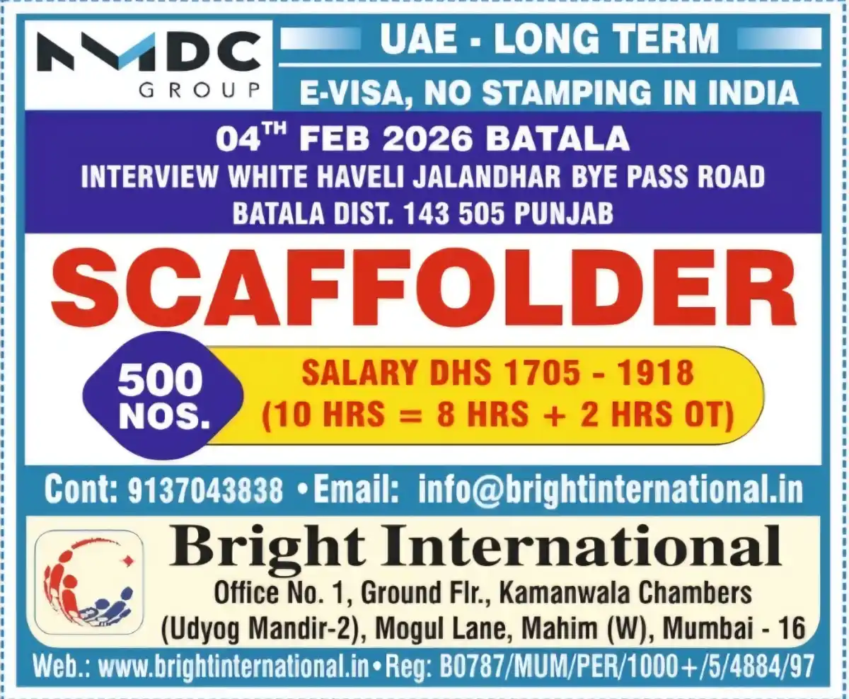 Apply for Scaffolder positions in UAE with E-Visa (no stamping in India). Salary DHS 1705-1918. Interview on 04th Feb 2026 at White Haveli, Jalandhar Bye Pass Road, Batala. Contact Bright International at 9137043838.
