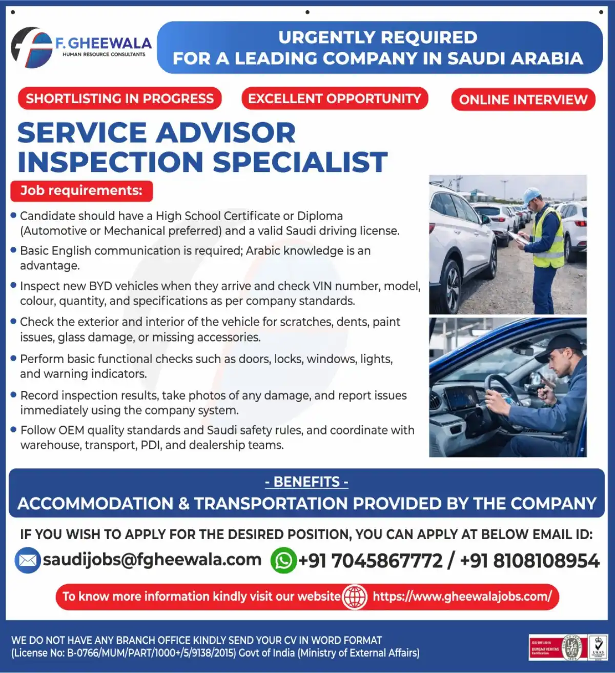 Apply now for Service Advisor & Inspection Specialist positions with accommodation & transport in Saudi Arabia. BYD vehicle inspection experience required. Immediate online interviews.