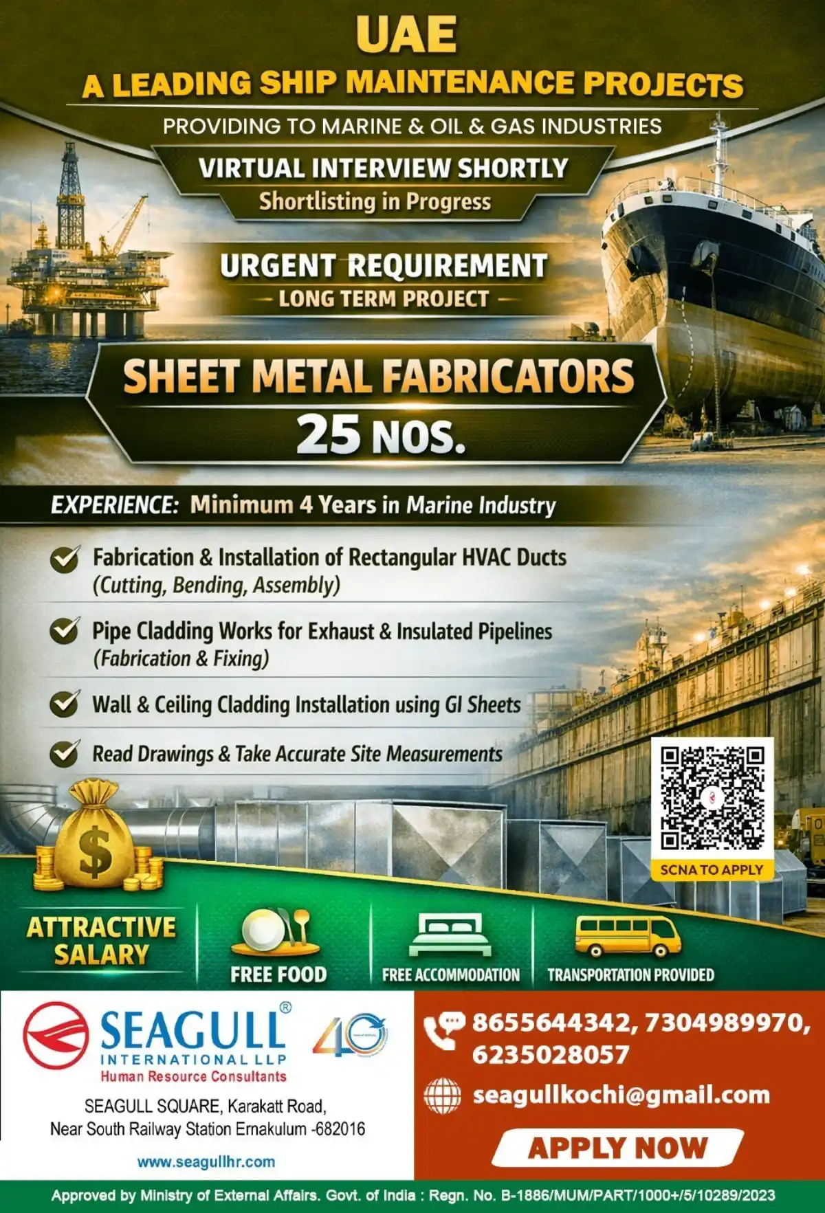 Seagull 40 International LLP, a premier human resource consultancy approved by the Ministry of External Affairs, Government of India, is urgently recruiting 25 Sheet Metal Fabricators for leading ship maintenance projects in the United Arab Emirates. This long-term assignment offers excellent career growth opportunities in the marine, oil, and gas industries.