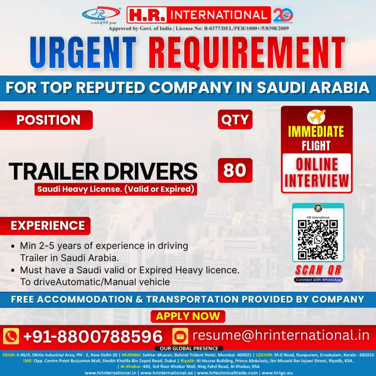 H.R. International, approved by the Government of India (License No: B-0377/DEL/PER/1000+/5/8398/2009), is urgently recruiting 80 Trailer Drivers for a top reputed company in Saudi Arabia. This is an immediate opportunity with online interviews and flight arrangements. Join a dynamic team and advance your career in a supportive environment.