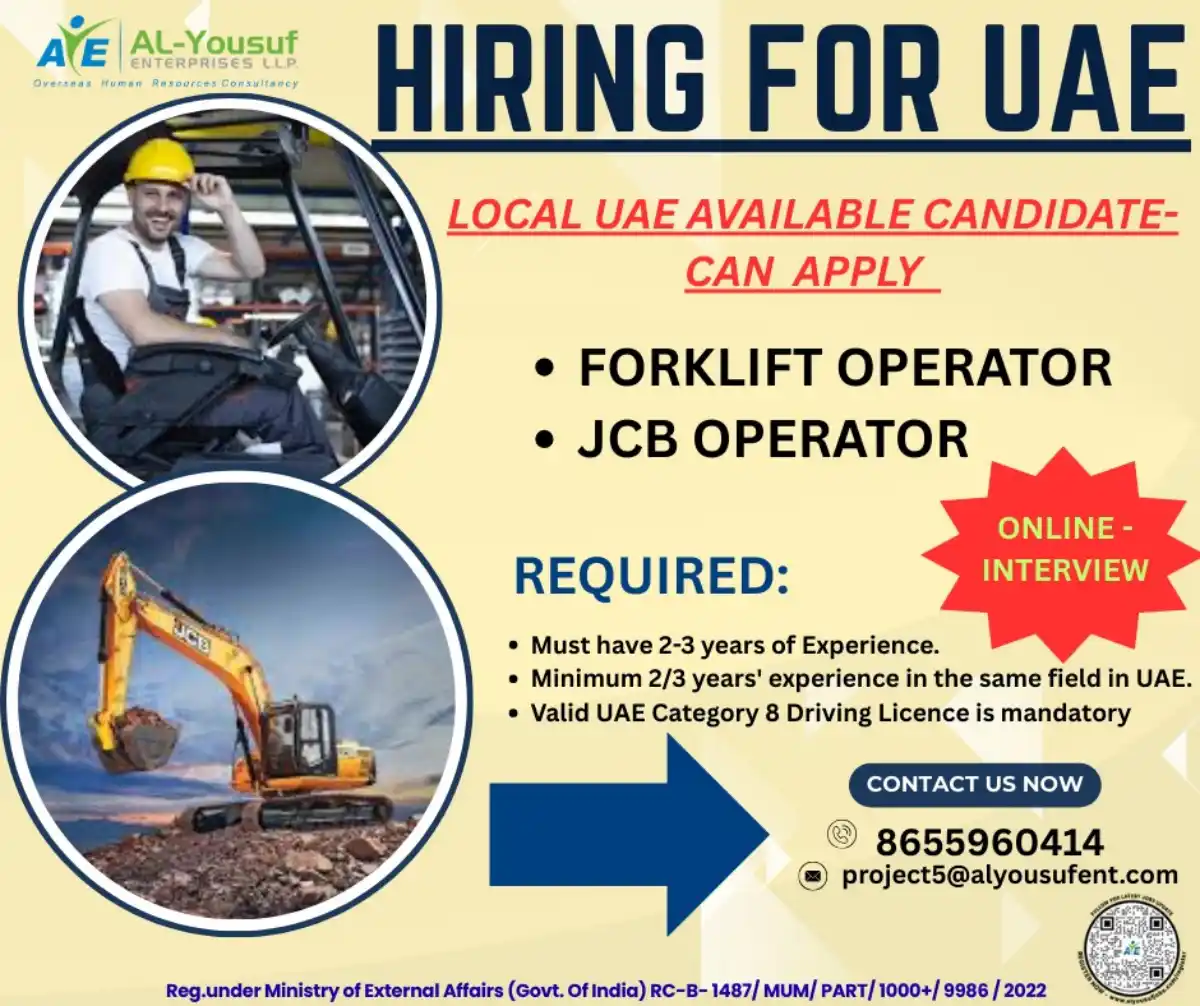 AE AL-Yousuf Enterprises LLP, a registered Overseas Human Resources Consultancy under the Ministry of External Affairs (Govt. Of India) RC-B-1487/ MUM/PART/1000+/9986/2022, is actively hiring skilled operators for positions in the United Arab Emirates (UAE). We are seeking dedicated professionals with experience in heavy equipment operation to join our team. Local UAE available candidates are encouraged to apply.