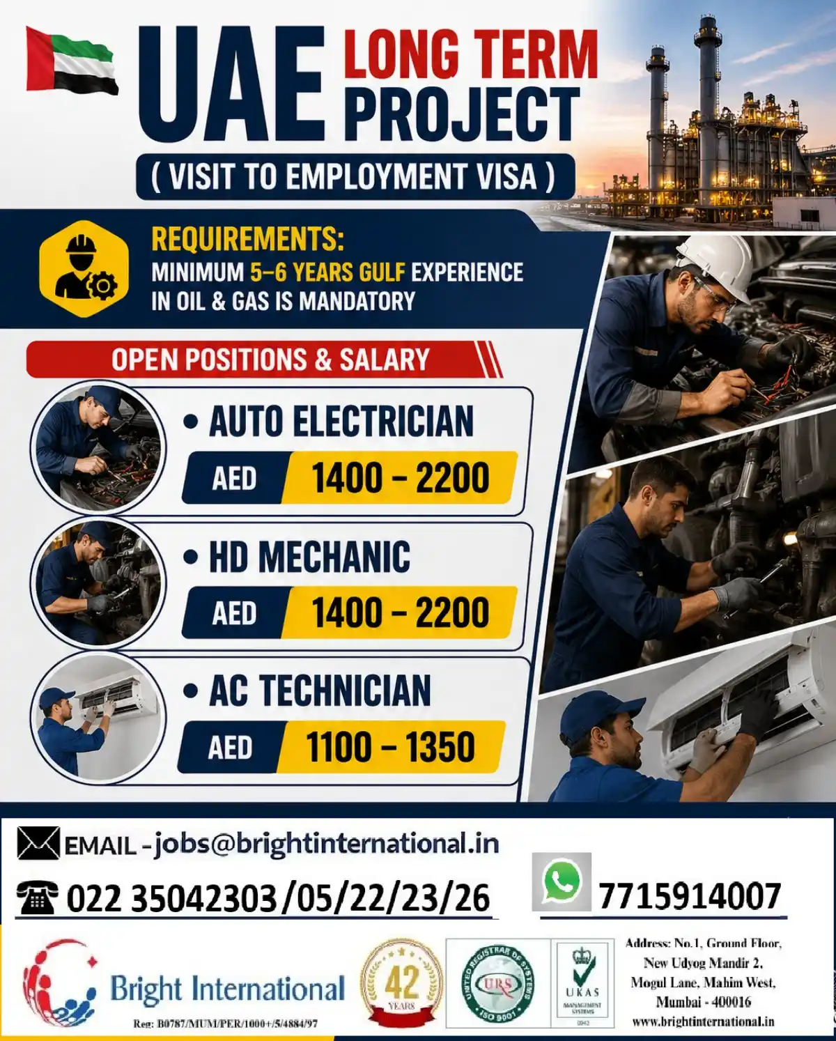 Apply for UAE long term project in Oil & Gas. Open positions: Auto Electrician, HD Mechanic, AC Technician. Minimum 5-6 years Gulf experience required. Visit to employment visa. Contact Bright International.