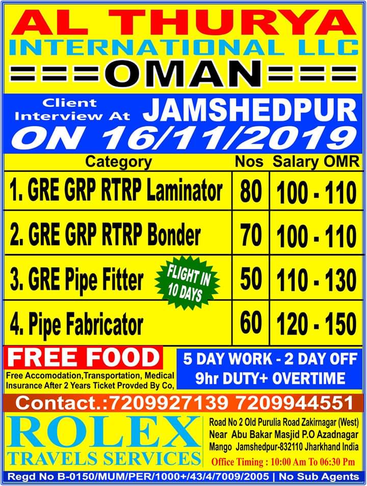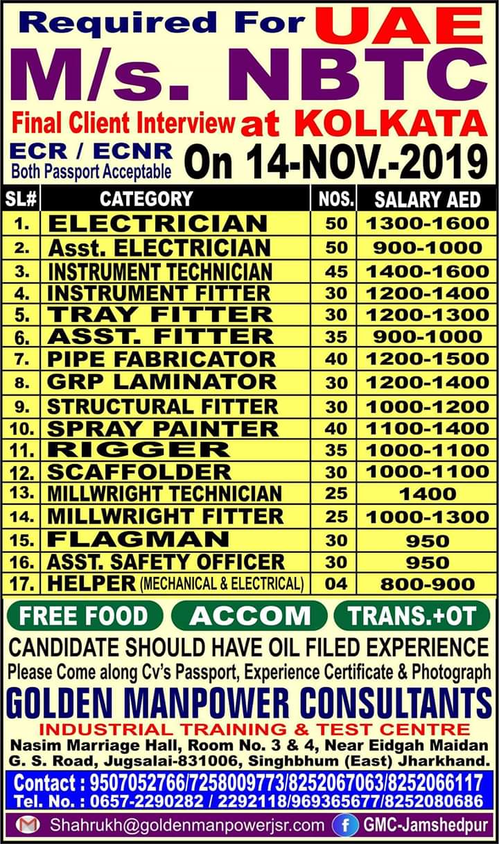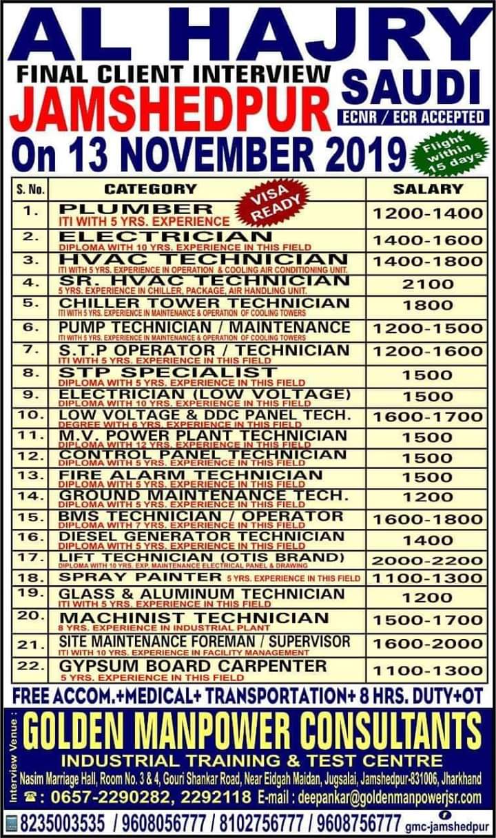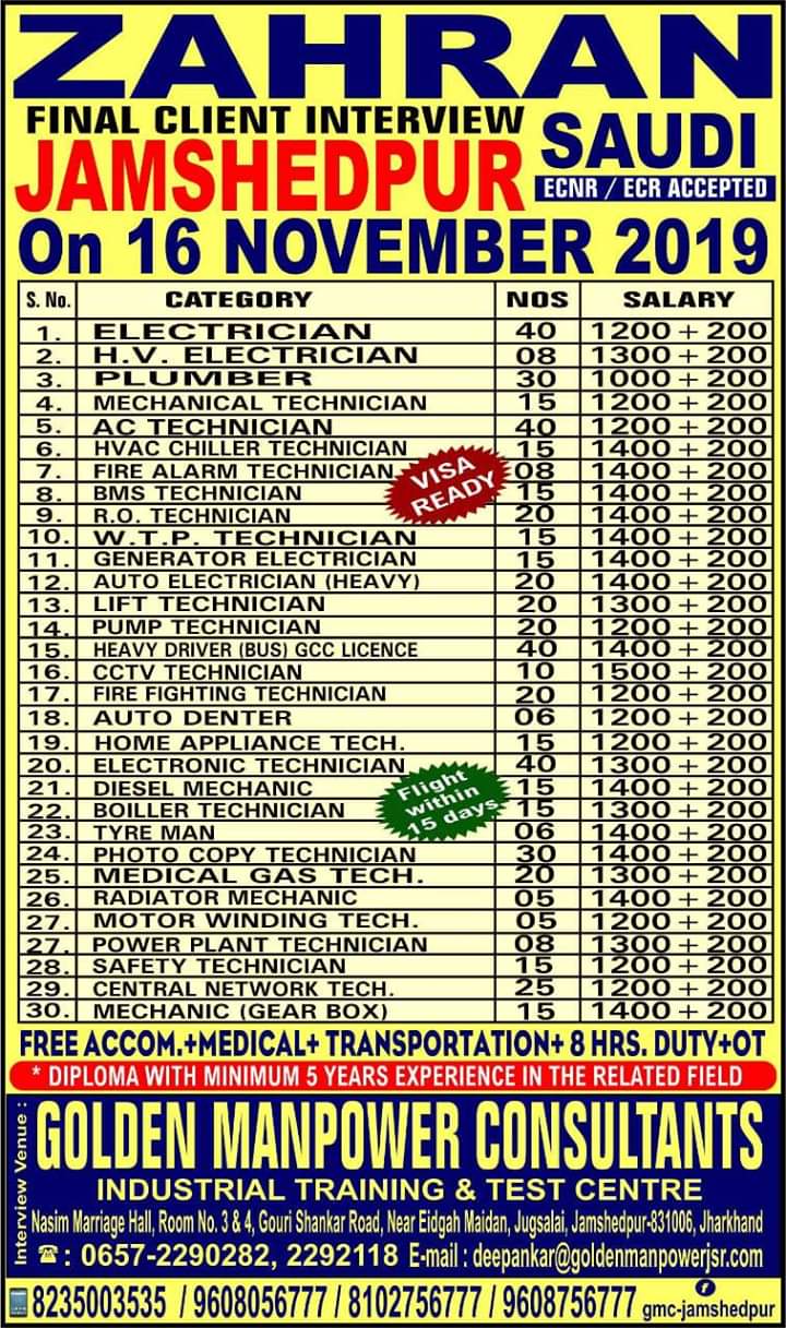 Golden manpower consultants is one of the good consultancy in tatanagar jharkhand. Various vacancies in various field is mentioned in vacancies image. Find the desired job position and contact with your original passport and CV to our office address as mentioned below.