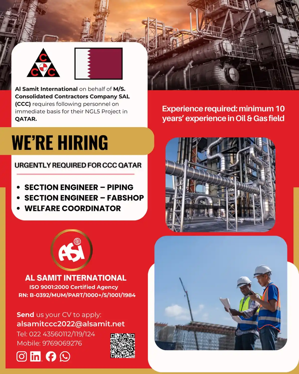 Apply now for urgent Oil & Gas jobs in Qatar with CCC. Positions include Section Engineer – Piping, Section Engineer – Fabshop, and Welfare Coordinator. Minimum 10 years experience required. Send your CV to alsamitccc2022@alsamit.net.