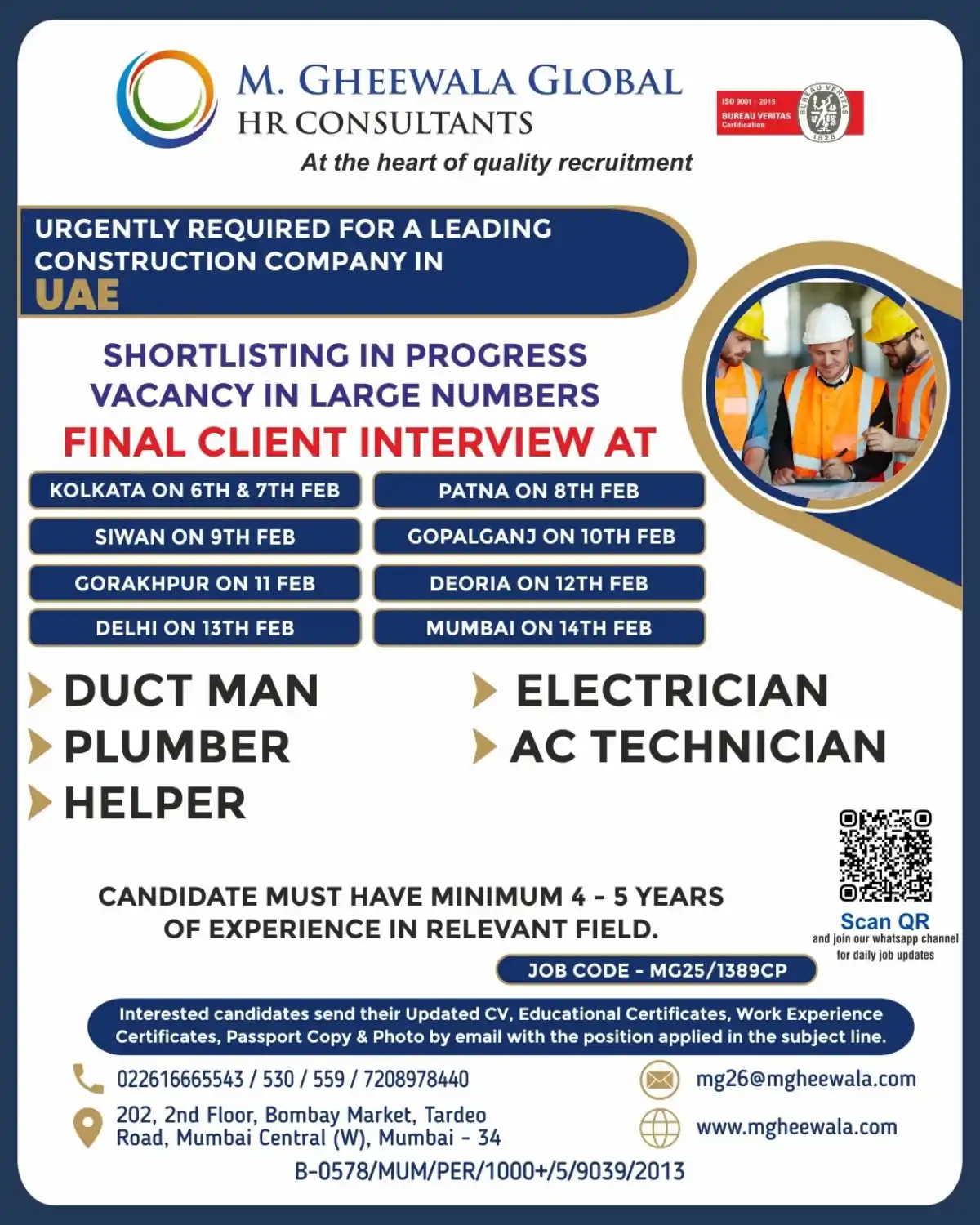 Leading ISO 9001:2015 certified construction company in UAE urgently hiring Duct Man, Plumber, Electrician, AC Technician & Helper. 4-5 years experience required. Final interviews in Kolkata, Delhi, Mumbai, Patna & other cities in February 2024.
