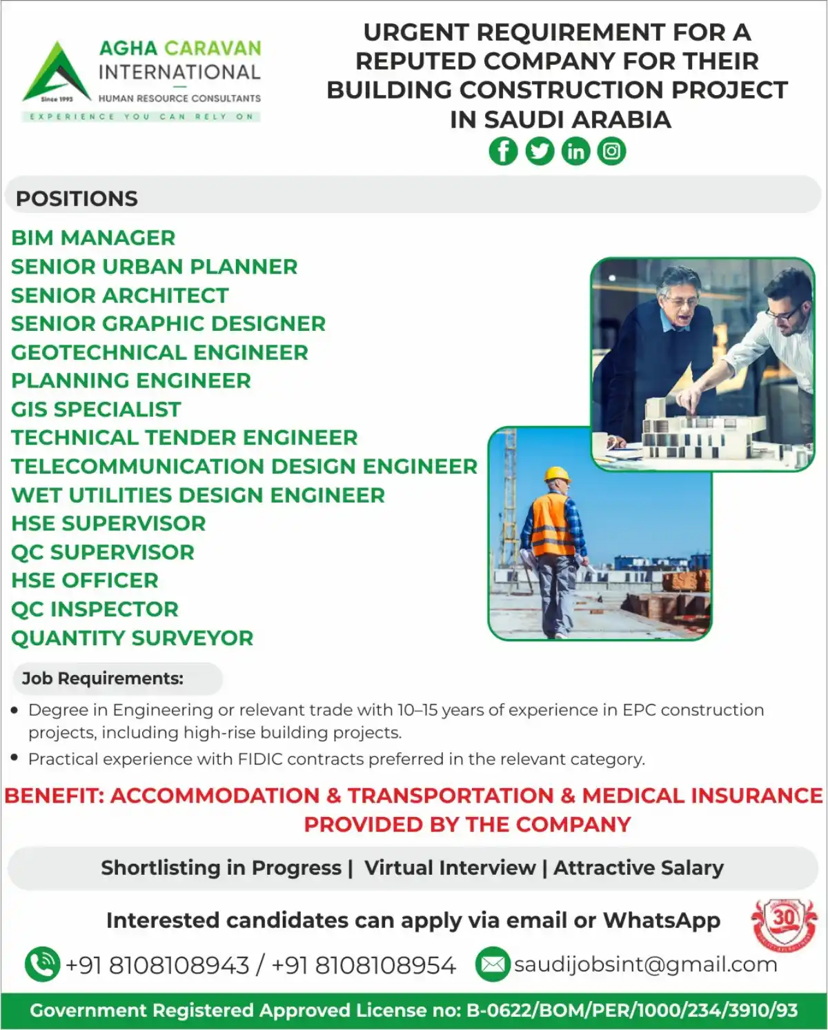 AGHA CARAVAN INTERNATIONAL, a trusted Human Resource Consultant since 1993, is conducting an urgent recruitment drive for a reputed company’s prestigious Building Construction Project in Saudi Arabia. We are seeking experienced and qualified professionals for immediate placement.